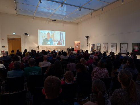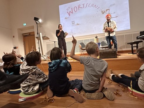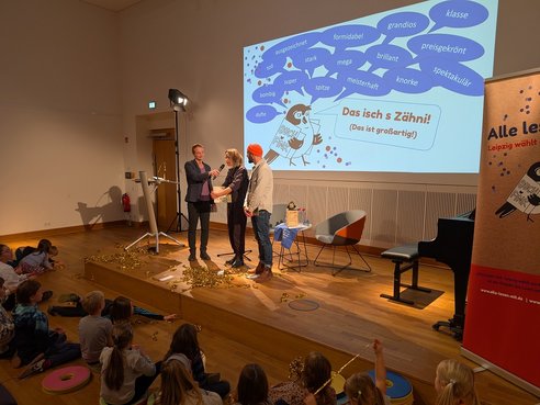 Zur Festveranstaltung am bundesweiten Vorlesetag, den 21. November 2025 um 16 Uhr, kamen etwa 45 Kinder und 110 Erwachsene in den Oberlichtsaal der Stadtbibliothek am Wilhelm-Leuschner-Platz. Durch das etwa einstündige Programm führte Moderator Larsen Sechert. Kulturbürgermeisterin Dr. Skadi Jennicke eröffnete den Nachmittag mit einem Grußwort, gefolgt von Mareike Friesel von den Leipziger Städtischen Bibliotheken. Der Kinderchor der Anna-Magdalena-Bach-Schule sang ein extra einstudiertes Buchfink-Lied. Ein kurzer Film über das Projekt „Alle lesen mit“ und eine interaktive Lesung von Rebecca und Simon rundete die Feierstunde ab. Danach durften sich die kleinen Gäste an selbstgebackenen Buchfink-Keksen gütlich tun und bei verschiedenen Angeboten wie dem Mitmalfilm oder dem Basteln einer (Wort)Schatztruhe kreativ werden und an einer Fotostation mit Greenscreen in die “Wortschatz”-Welt eintauchen. Die Spenden des Abends teilten wir uns mit der Wildvogelhilfe Leipzig, die sich nicht nur um verletzte Buchfinken kümmert.