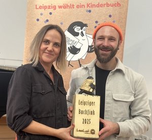 Mit einem Vorsprung von 32 Stimmen ging der Siegertitel nach einem langen Kopf-an-Kopf-Rennen aus dem Voting hervor. Zur Verleihung am 21. November 2025 reiste das super sympathische Autoren-Illustratoren-Pärchen aus der Schweiz an und nahm den 1. “Leipziger Buchfink” persönlich und sichtbar bewegt entgegen: